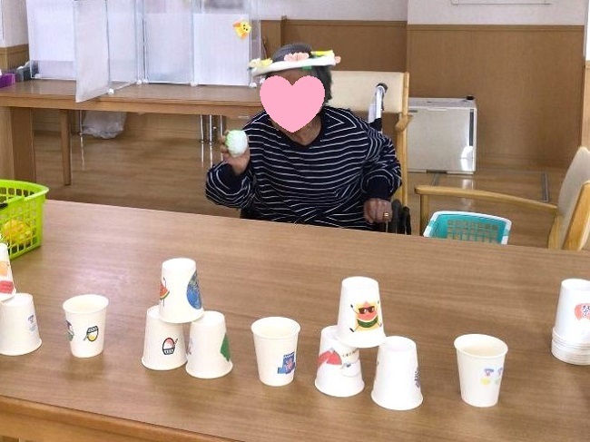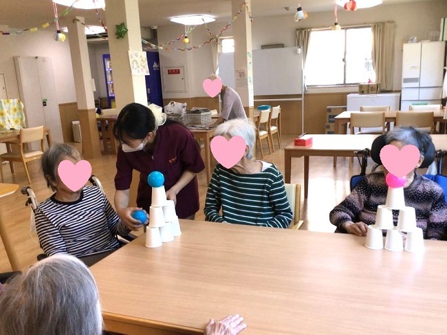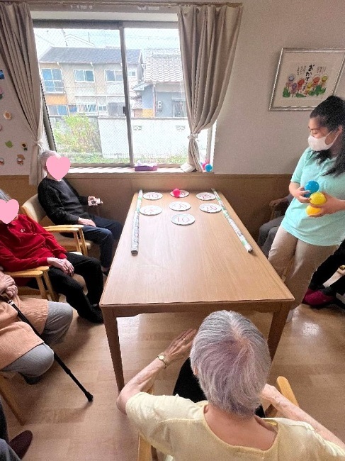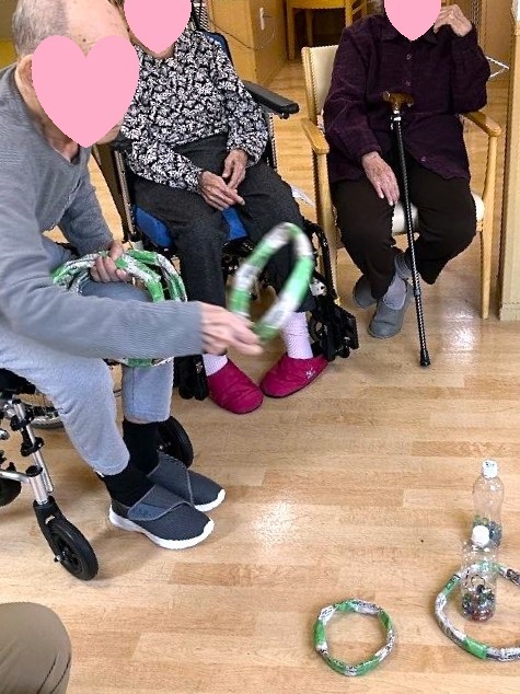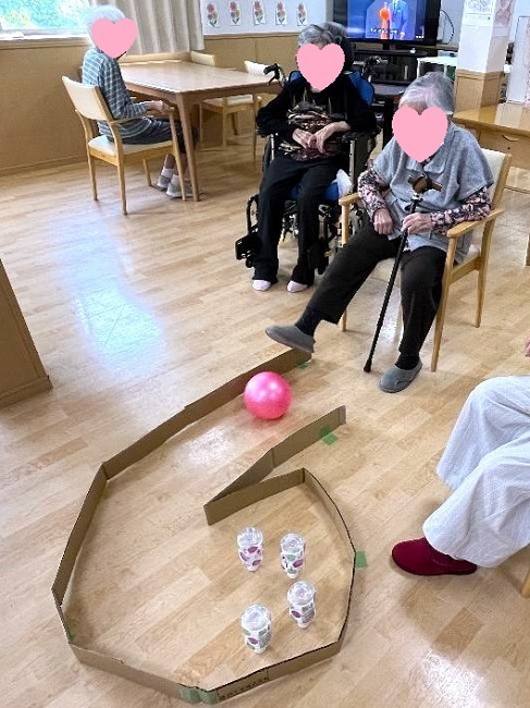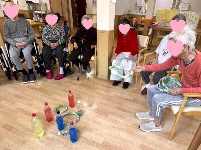 動画を見ながらのお口の「パタカラ体操」や体をほぐす体操、輪投げやボールを使った様々なゲームを実施しました。