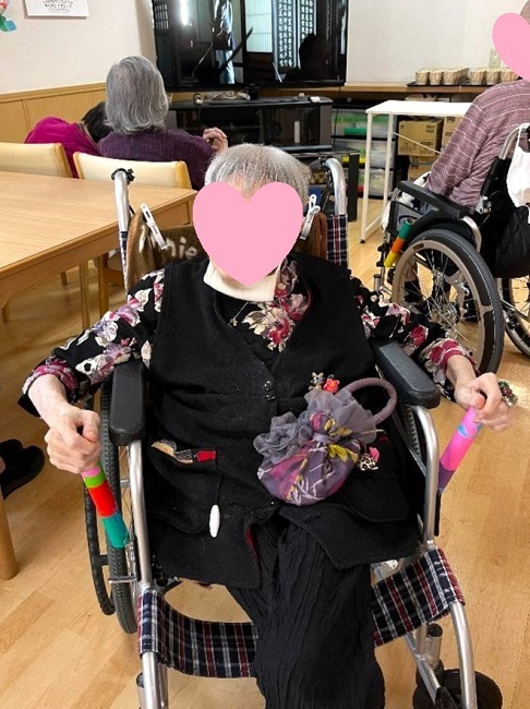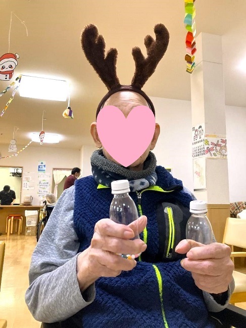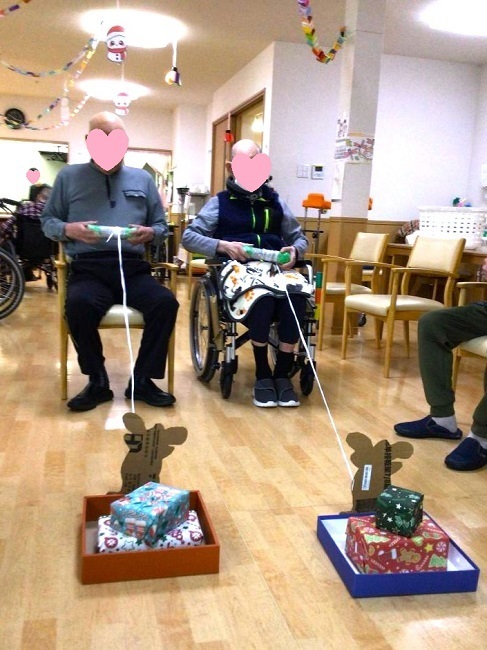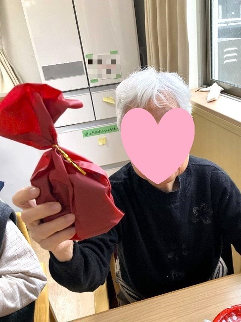 サンタさんが利用者様にクリスマスプレゼントを配りました。プレゼントの内容はくじ引きにて