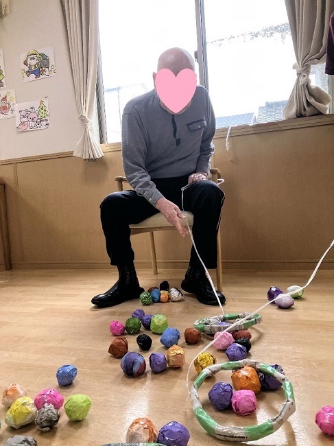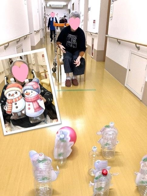 クリスマスソングを歌い、「雪だるまボーリング」や紐の先に付けた輪っかでボールを集める「玉集め」、長い紐を巻き取ってそりを引っ張る「リンリン引き」など、ちょっと趣向を凝らしたゲームで盛り上がりました。