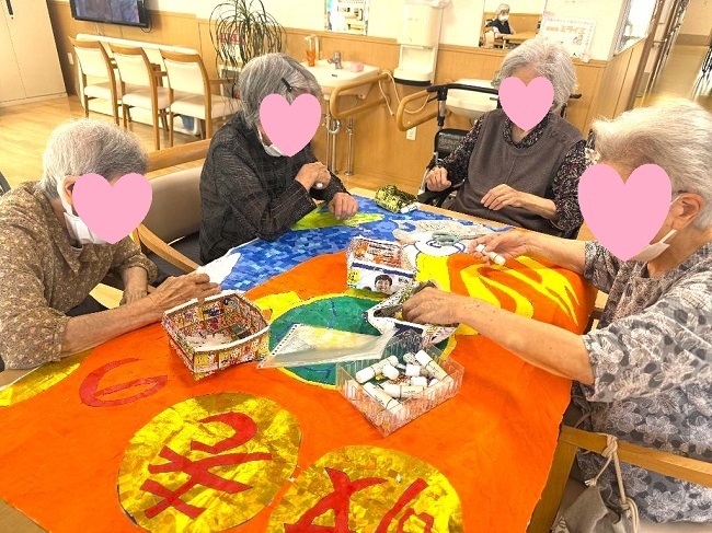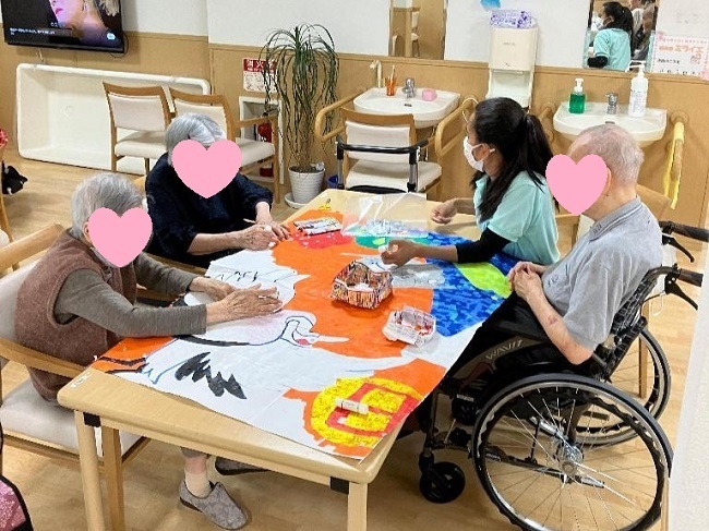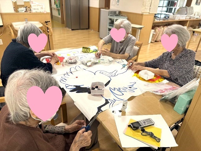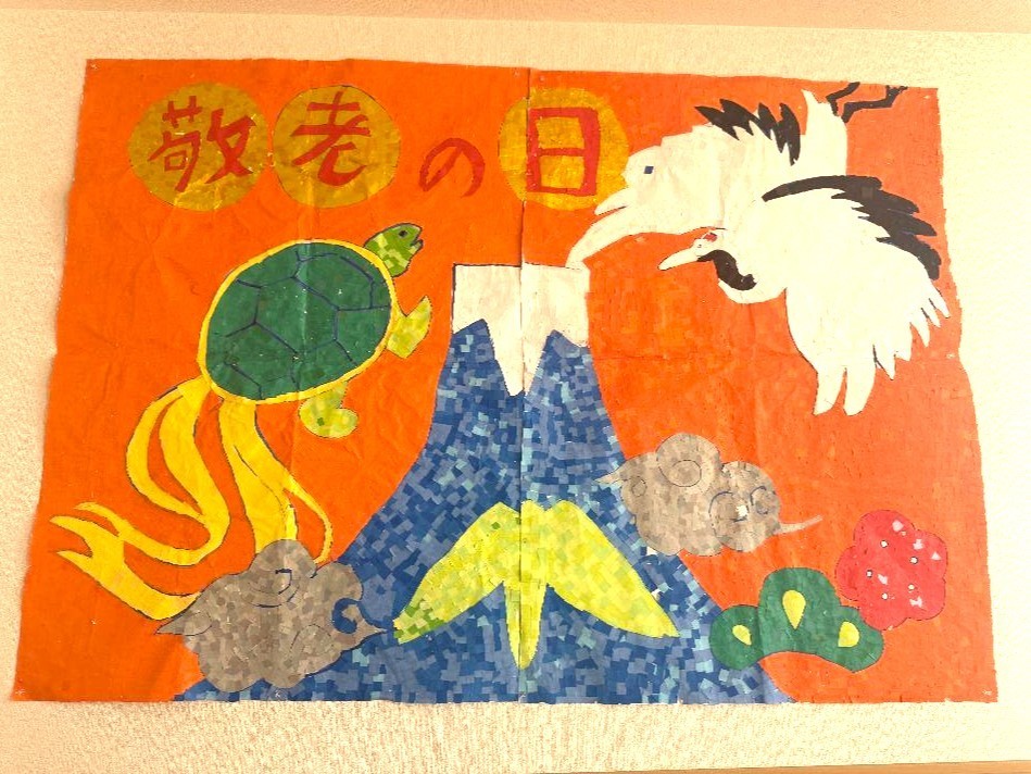 また、この日に向けて、「鶴と亀」の超大作貼り絵に挑戦。制作の様子をご紹介します。貼り絵職人多数在籍しておりますので、素晴らしい作品ができました。もはや芸術の域に達しております。
