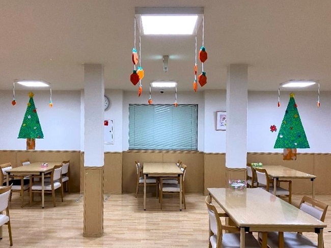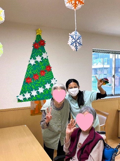 そして、見事なクリスマス会場をご覧いただけましたか! 「飾り・壁画・一生溶けない雪だるま・サンタの貼り絵」全てご入居者様との手作りなのだそうです。この日の為に、ひと月半かけましてございます。