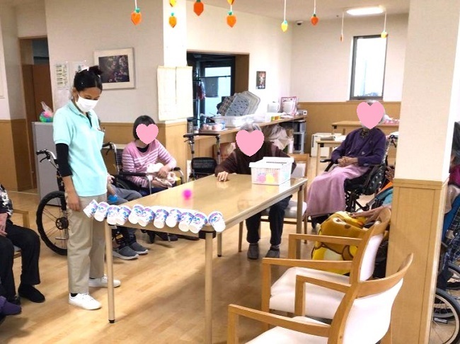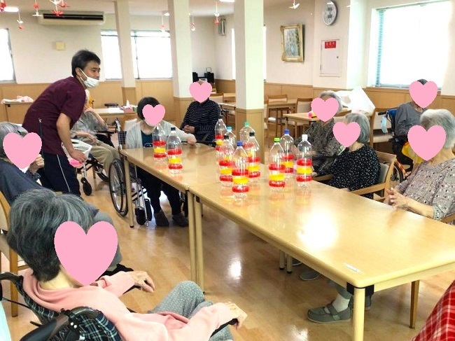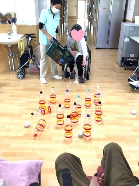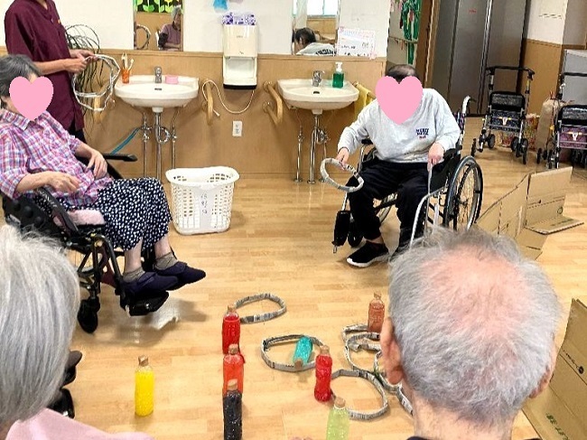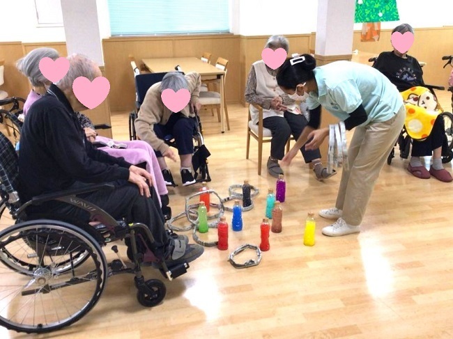 明るいフロアで、色とりどりのペットボトルを使った輪投げレクリエーションを行いました。みなさん笑顔で挑戦され、楽しいひとときを過ごされました。体を動かしながら交流できる、人気のアクティビティです!