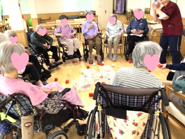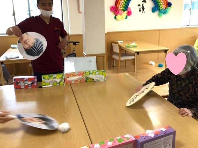 ボールを使ったゲームでは、投げたり転がしたり、うちわで打ったりボールの大きさや種類を変えるなど、趣向を凝らしているようです。