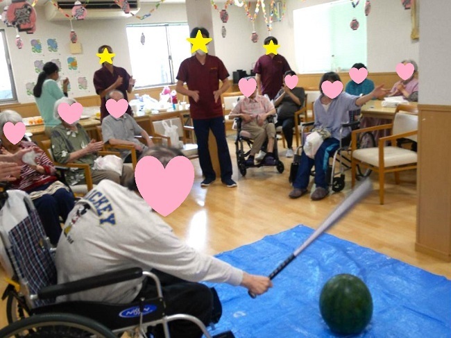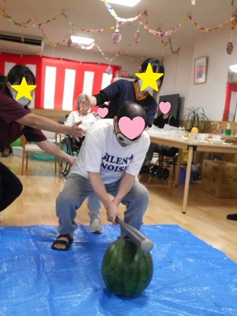 恒例の「スイカ割り」はご家族様に大活躍いただき、4人目で無事割れました。とても甘いスイカで、皆で食べて残りは夕食のデザートにいただきました。