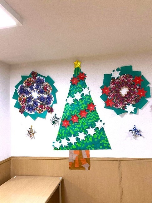 今年は、壁面に大きなツリーと華やかなリースが登場!シンプルな飾りつけで、いつも過ごす空間が『おしゃれカフェ』の様になりました。
