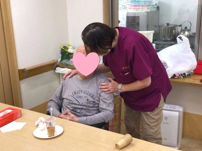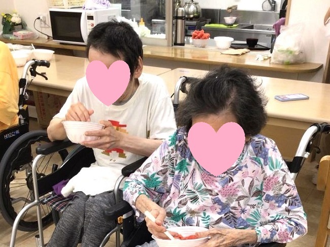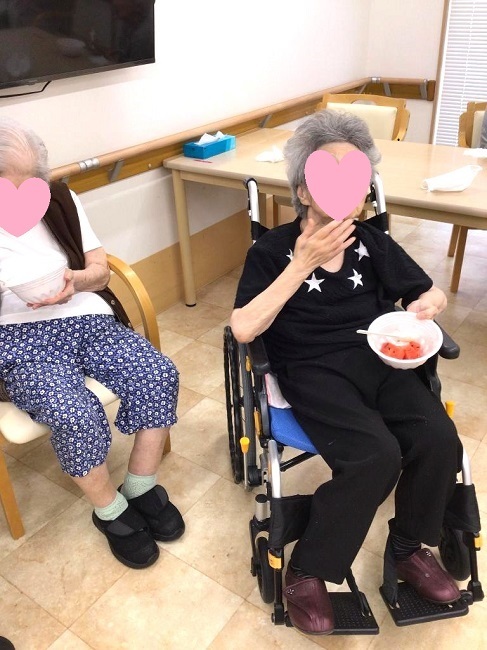 大きな写真を見ての名前当てクイズ「この人誰でしょうゲーム」では、スタッフの写真が紛れていて大笑い。出題されるなり口々に即回答。「手品ショー」など出し物の後、「お楽しみおやつタイム」では、フルーツゼリーとアイスクリームをご提供いたしました。
