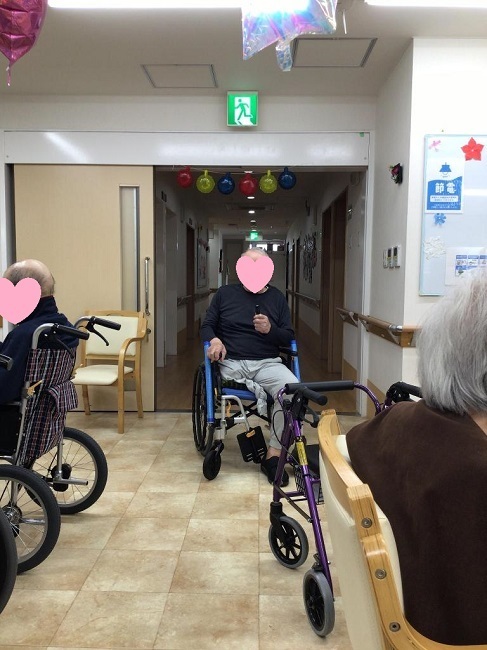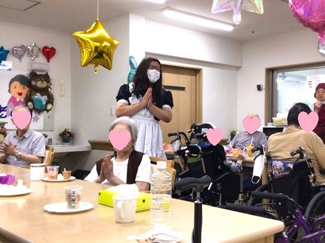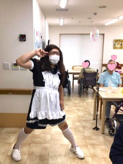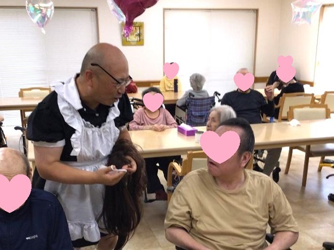 メイド姿のスタッフ(マッチョ男子!)の登場でびっくり大盛り上がり。「この鐘を鳴らすのはあなた」を熱唱させていただきました。入居者様も負けじと「津軽海峡冬景色」「見上げてごらん夜の星を」を大熱唱。ご自慢の喉を披露されました。
