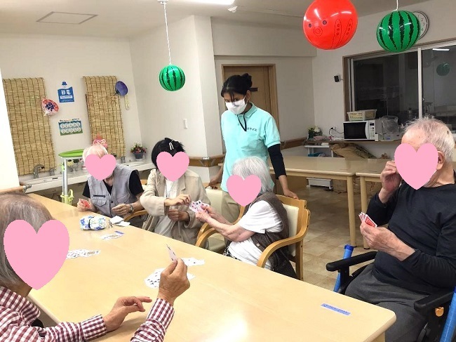 スタッフ手作りの「すごろく、絵合わせ・色合わせゲーム」やジェンガやトランプなどで、それぞれの時間をお過ごしです。今シーズンは「ババ抜き」ブーム到来しているようです。