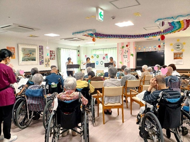 歌詞カードが配布され、楽しく歌ったり手拍子でリズムをとったりと楽しい時間を過ごされました。歌詞カードにのっていない曲もサプライズ演奏いただき、優しい演奏に涙を流しておられる方もいらっしゃいました。