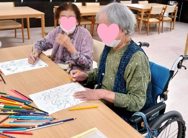 施設では、月初にその月の塗り絵カレンダーや、季節に合ったテーマで塗り絵をされています。また、気分によりポケモンやスーパーマリオのキャラクターをチョイスされることも。