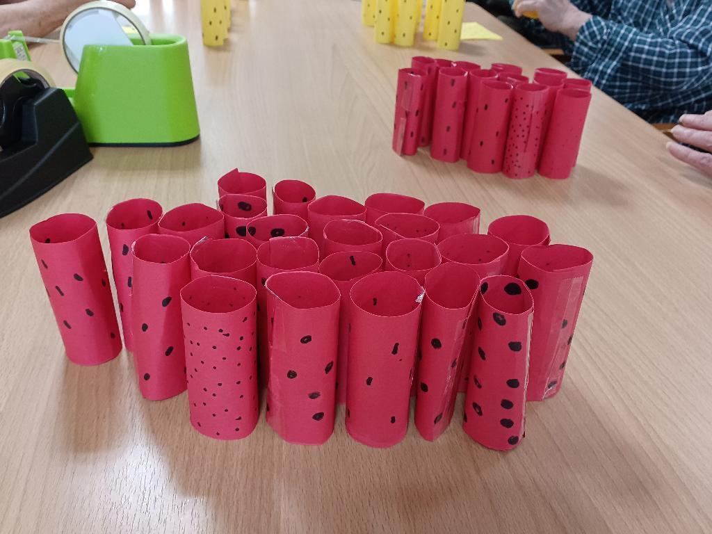 壁の飾り付けのペーパーフラワーをはじめ、うちわ、ゲームで使うスイカなどを制作いたしました。職人技をご覧ください。
