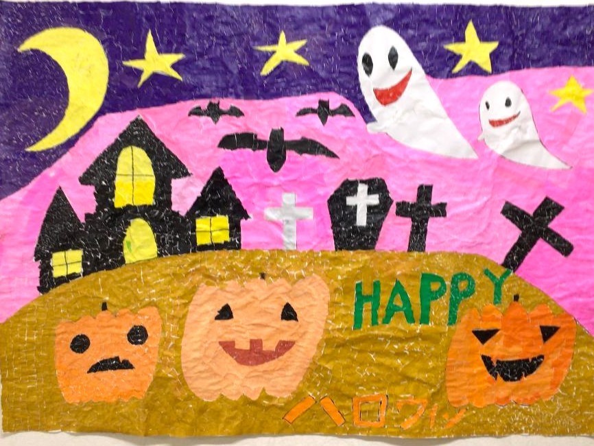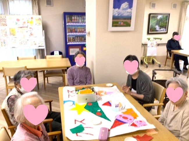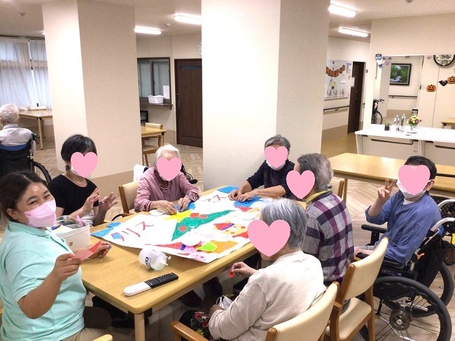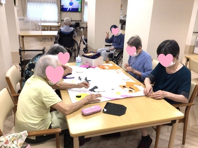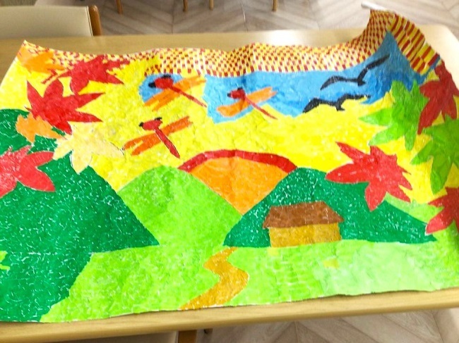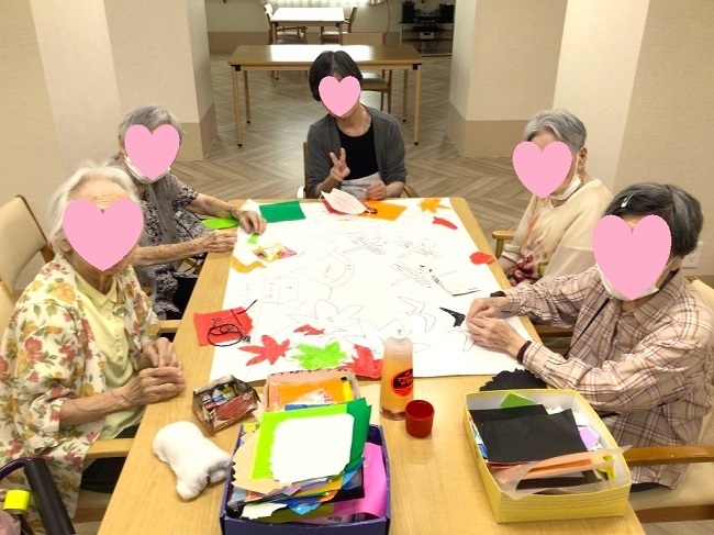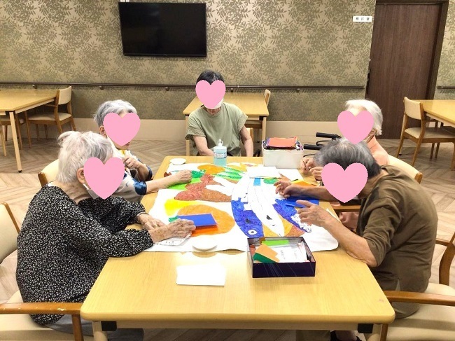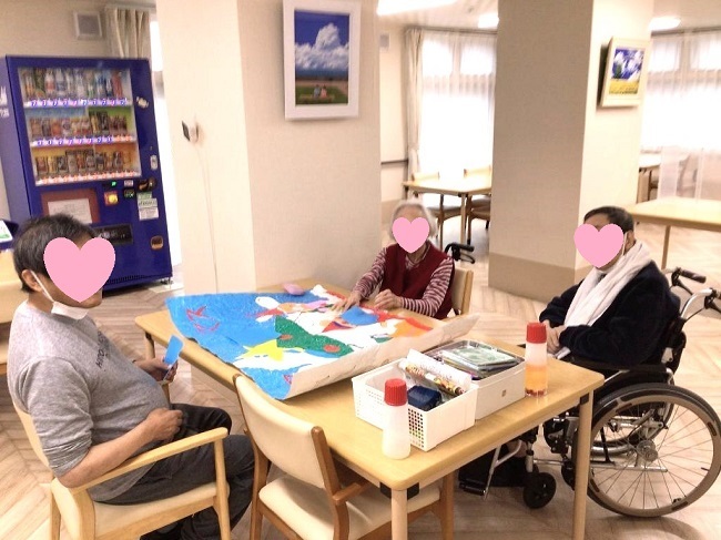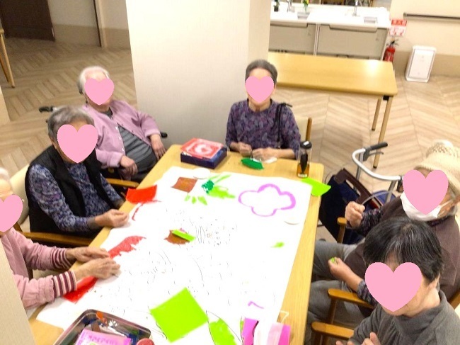 工作レクリエーションとして、季節にあったテーマで貼り絵をしています。完成作品は、施設内で掲示し、季節の移り変わりを彩って、皆さまの目を楽しませているようです。