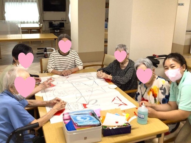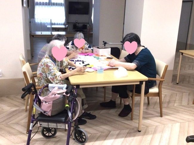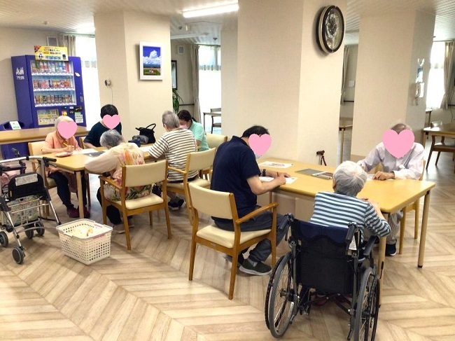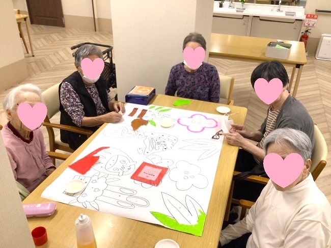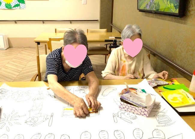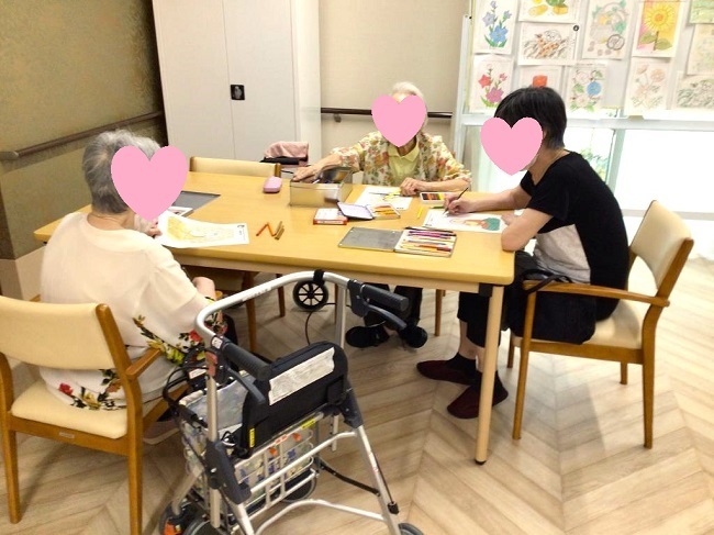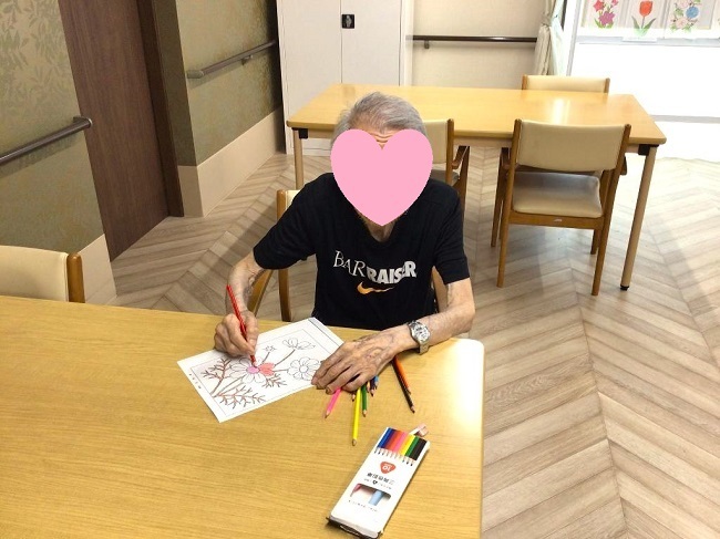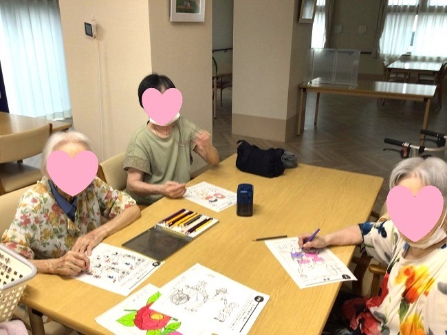 隙間時間にぴったりな塗り絵は、工作レクの中でも人気です。おしゃべりしながら、音楽を聴きながら、また黙々と集中し取り組まれています。