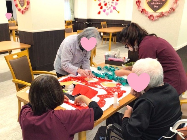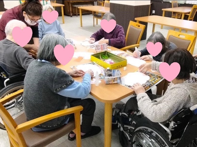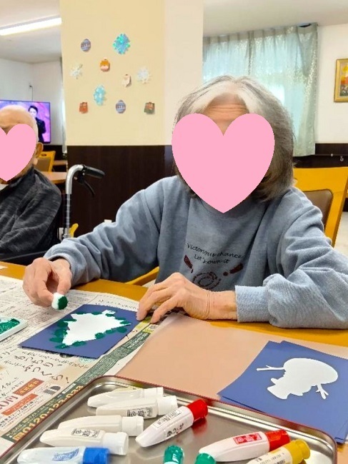 2月の節分に向けて、『鬼の貼り絵』制作中です。ティッシュの空き箱で『テーブルボール・ラリー』や様々な体操で身体を動かします。