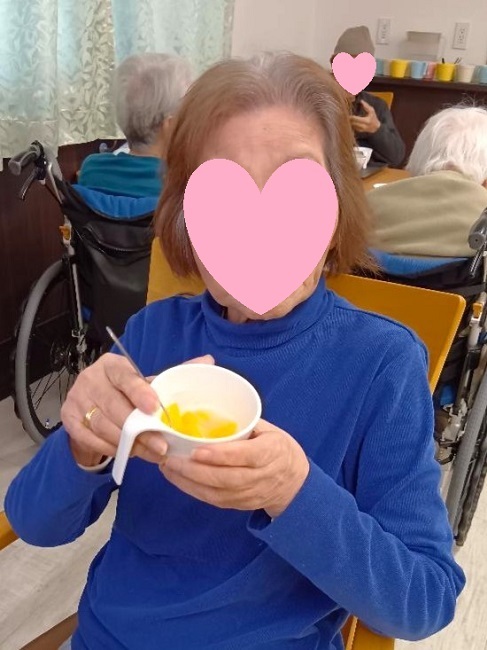 YouTube体操で身体をしっかり動かしたあとに、おやつと共にティータイム。カステラに柿を添えてお出ししました。
