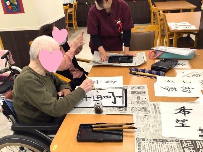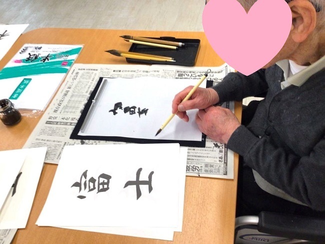 書き初めでは「久しぶりに字を書いた」と笑顔を見せられながら、真剣に取り組んでおられました。こちらは後に壁へ貼り出されました。