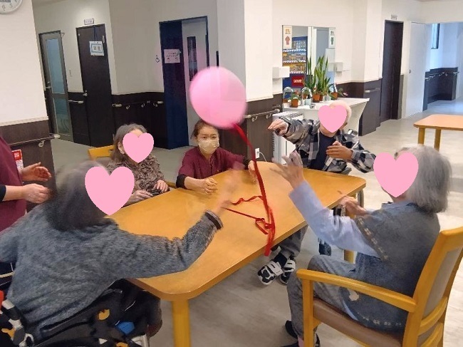 14日には『ビニール風船バレー大会』を開催。上を見上げてふわふわボールでバレーをしました。慣れてくると、バシッとスパイクして日頃のストレス発散。歓声をあげて楽しみました。