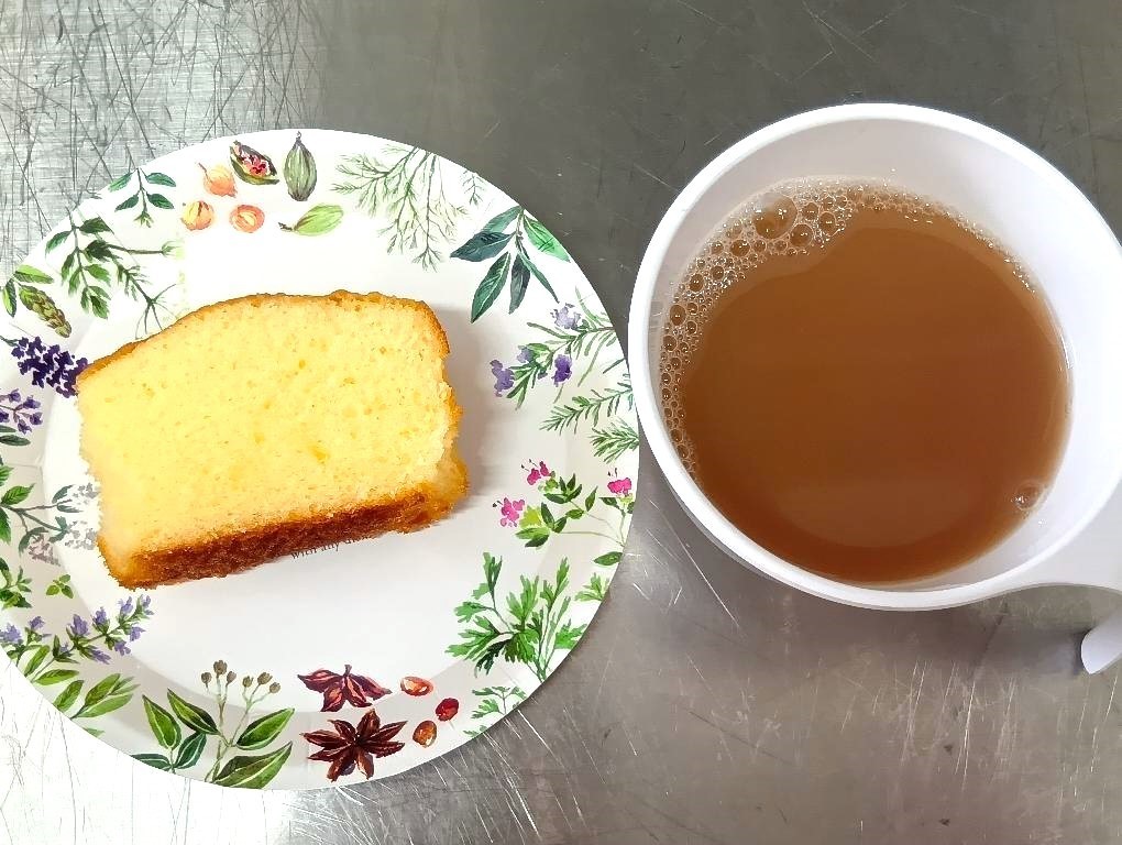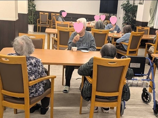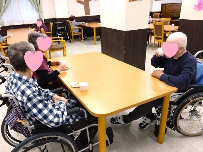 体操レクの後はカステラと『本日のお任せドリンク』でお楽しみティータイム。まったりおしゃべりしながら過ごされているようですね。